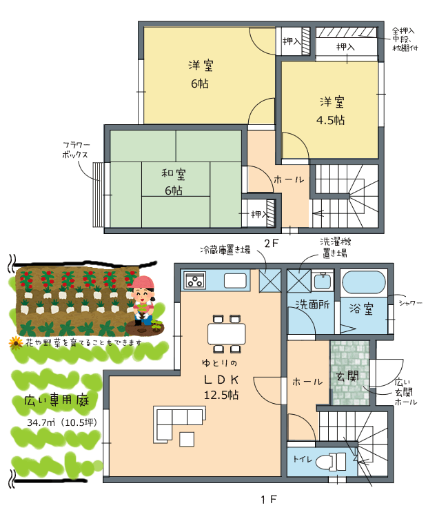 1.一戸建のような広い庭付きで家庭菜園も楽しめ、